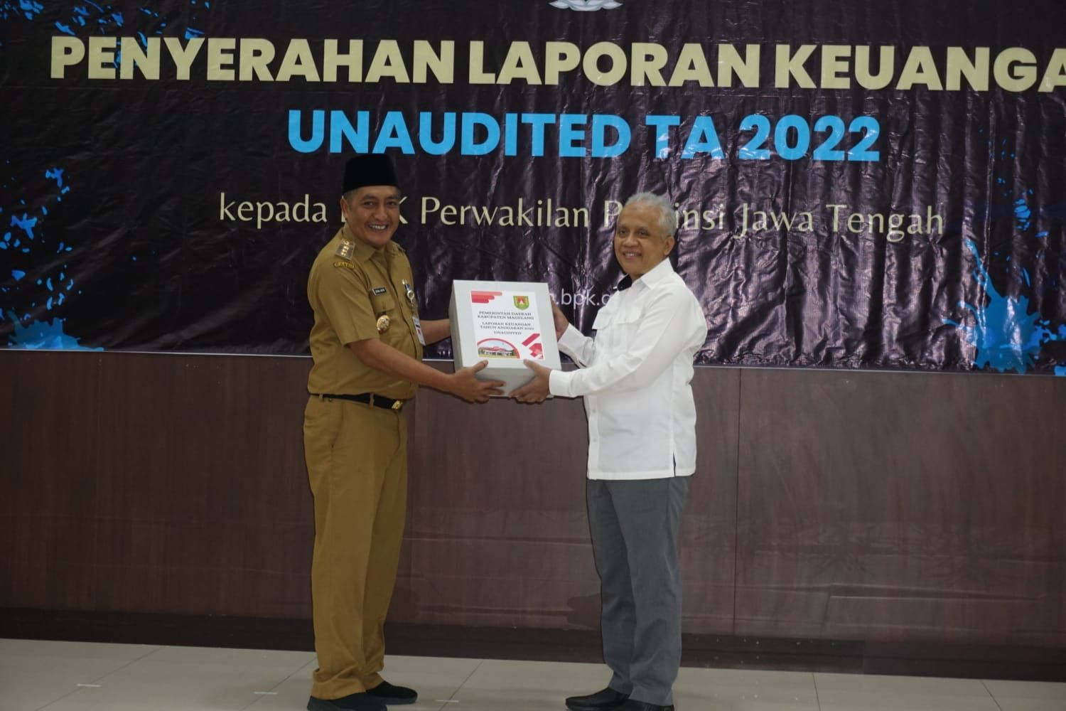 RILISJATENG.COM – Bupati Magelang Zaenal Arifin didampingi Inspektur Kabupaten Magelang, Iwan Sutiarso dan Kepala BPPKAD Kabupaten Magelang, Siti Zumaroh menyerahkan Laporan Keuangan Pemerintah Daerah (LKPD) Unaudited Tahun Anggaran 2022 kepada BPK Perwakilan Provinsi Jawa Tengah, di Gedung BPK Jawa Tengah, Semarang, Senin (20/3).
